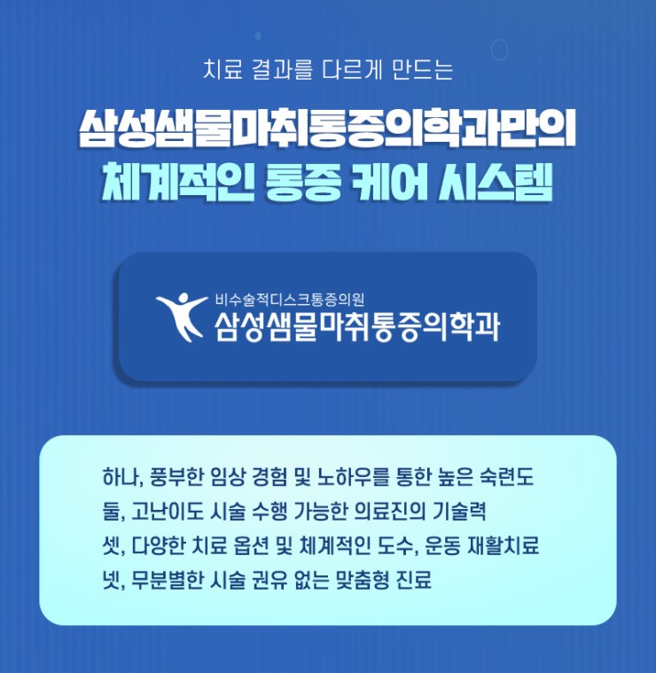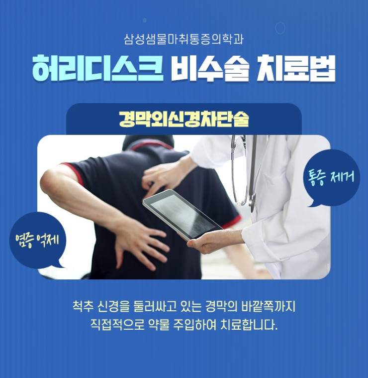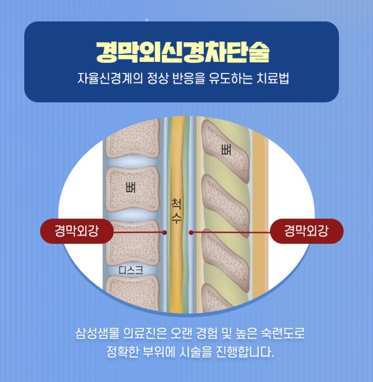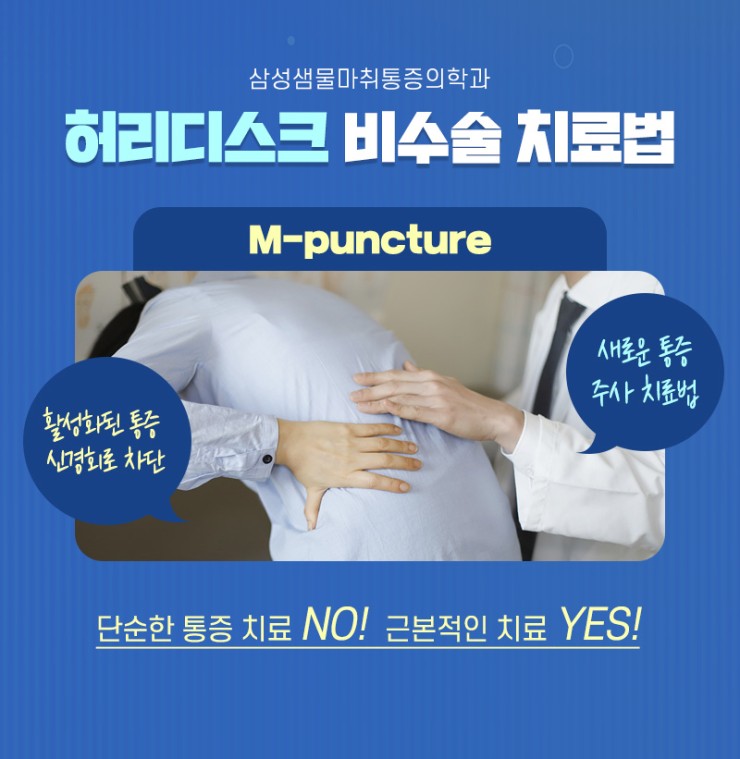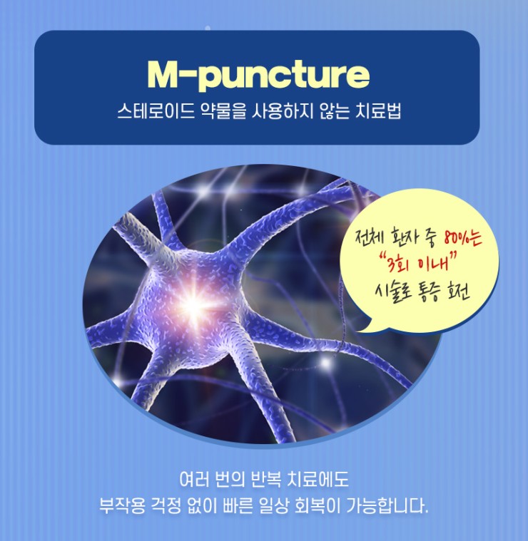 비수술 치료 중 하나인 경막외 신경차단술은 척추 신경을 감싸는 경막 바깥에 약물을 주입해 염증을 완화하고 통증을 줄이는 방법입니다. 디스크나 신경통으로 인한 증상에 효과적이며, 숙련된 기술력이 요구되는 치료법입니다. 또 다른 방법인 M-Puncture 시술은 스테로이드에 의존하지 않고, 특허받은 미세바늘을 사용해 근육·신경·인대를 동시에 치료할 수 있는 장점이 있습니다. 보통 3회 이내 치료만으로도 큰 호전을 기대할 수 있으며, 반복 시술에도 부작용이 거의 없어 안전하게 시행됩니다.