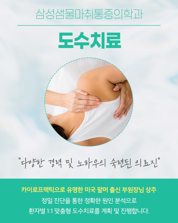 도수치료는 숙련된 의료진이 직접 손을 이용해 신체의 틀어진 부분을 교정하고 근육의 긴장을 완화시키는 치료법입니다. 대상포진 신경통 환자의 경우, 오랜 통증으로 인한 근육 경직과 자세 불균형이 동반되기 쉬워 도수치료를 병행하면 통증 완화 효과가 더욱 높습니다. 삼성샘물에는 미국 팔머 카이로프랙틱 전문 교육을 수료한 부원장이 상주하며, 정확한 진단을 통해 1:1 맞춤 도수치료를 시행하고 있습니다. 이는 단순 마사지 수준이 아닌, 신경 압박 완화와 관절 가동 범위 회복을 위한 전문 치료입니다.
