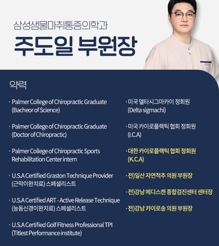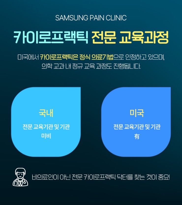 중요합니다. 삼성샘물마취통증의학과에서는 미국 팔머 카이로프랙틱 대학 출신의 주도일 부원장이 상주하여, 국제 기준의 안전한 교정 치료를 제공합니다. 시술 후에는 Before & After 엑스레이 비교와 교정 결과 설명을 통해 환자 스스로 몸의 변화를 이해할 수