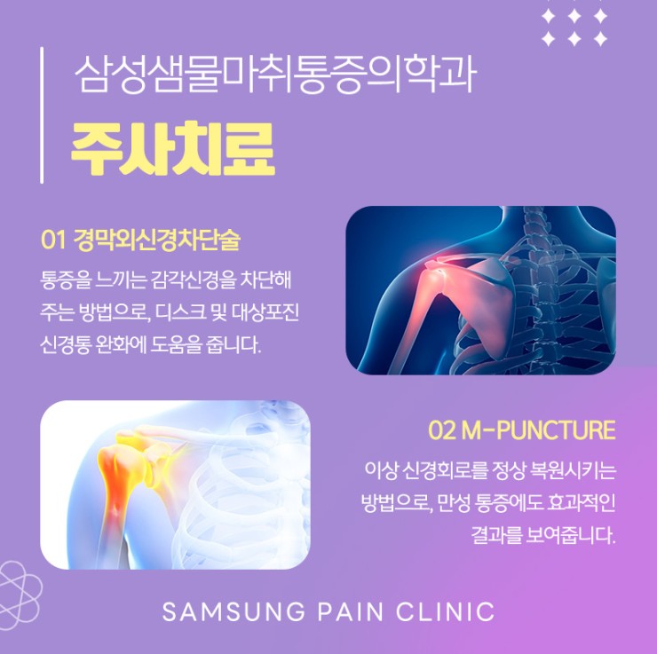 오십견 환자 대부분은 수술 없이도 충분히 회복할 수 있습니다. 초기에 통증이 심할 때는 약물치료나 경막외신경차단술로 염증을 완화시켜 통증 전달을 차단합니다. 국소마취 하에 시행되며, 어깨뿐 아니라 목·허리·대상포진 신경통 등에도 효과적입니다.