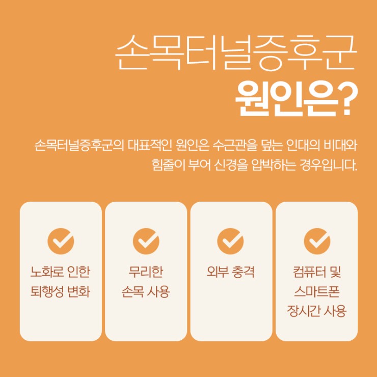 수근관이 좁아지며 신경이 압박받는 구조적 문제입니다