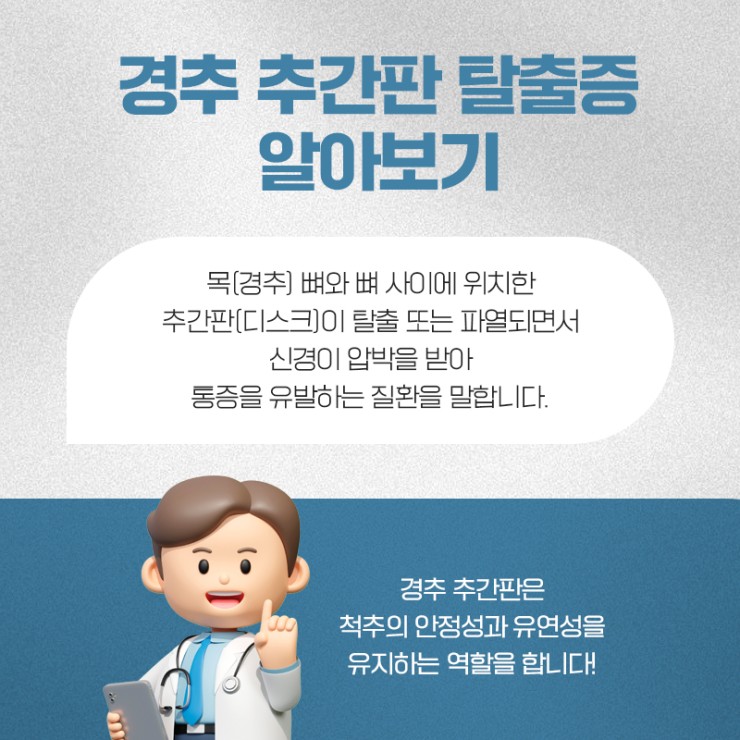 경추 추간판 탈출증은 흔히 ‘목디스크’라고 불리는 질환으로, 목뼈와 목뼈 사이에 위치한 추간판이 제자리를