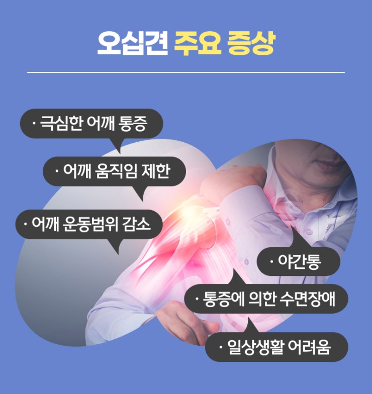 올릴 때 강한 저항감과 통증이 나타나고, 특히 야간통으로 인해 수면에 지장을 주는 사례가 많아 일상생활의