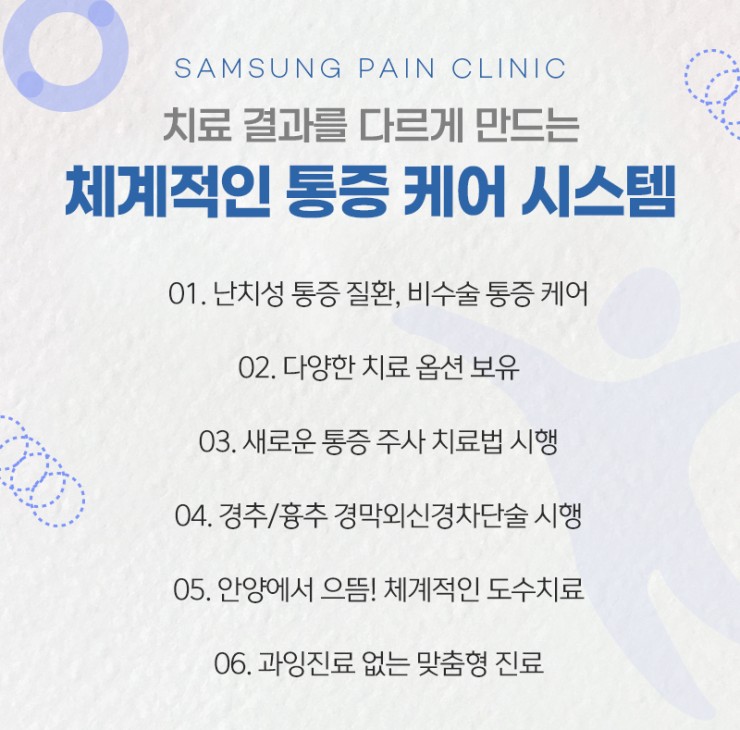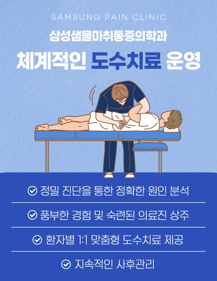 삼성샘물마취통증의학과는 환자 중심의 진료 철학을 기반으로, 과잉 진료 없이 꼭 필요한 치료만 권장합니다. 최신 치료 장비와 학회 활동을 통해 꾸준히 연구하며, 환자에게 최적화된 치료법을 제시합니다. 여름철은 활동량이 많아 허리 통증이 악화되기 쉬운 시기입니다. 단순 근육통으로 오인하고 방치하면 디스크나 협착증으로 진행될 수 있으므로 조기 진단이 중요합니다. 호계·평촌 정형외과는 비수술 치료와 도수치료, 카이로프랙틱 등 다양한 방법으로 환자의 상태에 맞는 솔루션을 제공합니다. 환자 한 사람, 한 사람의 생활 패턴과 연령, 증상을 고려한 맞춤 치료를 통해 단순히 통증을 없애는 것을 넘어 삶의 질을 높이는 것을 목표로 하고 있습니다.